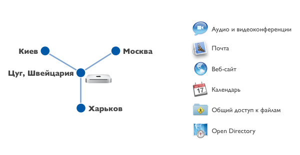 Сервер предоставляет как стандартные сервисы – IMAP-почта, вебсайт, совместный календарь и общий доступ к файлам, так и не очень стандартные – например iChat. iChat – это Jabber сервер с аудио-видео возможностями. Позволяет проводить видео конференции с участием до 4-х человек – то, что в Skype сейчас предоставляется как платная фича. Преимуществом iChat является то, что вы можете использовать его для коммуникаций между удаленными офисами, и при этом будете уверены в том, что информация не оседает ни на каких чужих серверах.