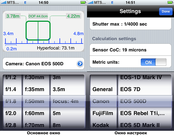 myPhotoDOF это калькулятор глубины резкости (Depth-of-Field) для iPhone. Идея этого калькулятора в том чтобы визуально отображать область глубины резкости, что очень удобно для фотографа.