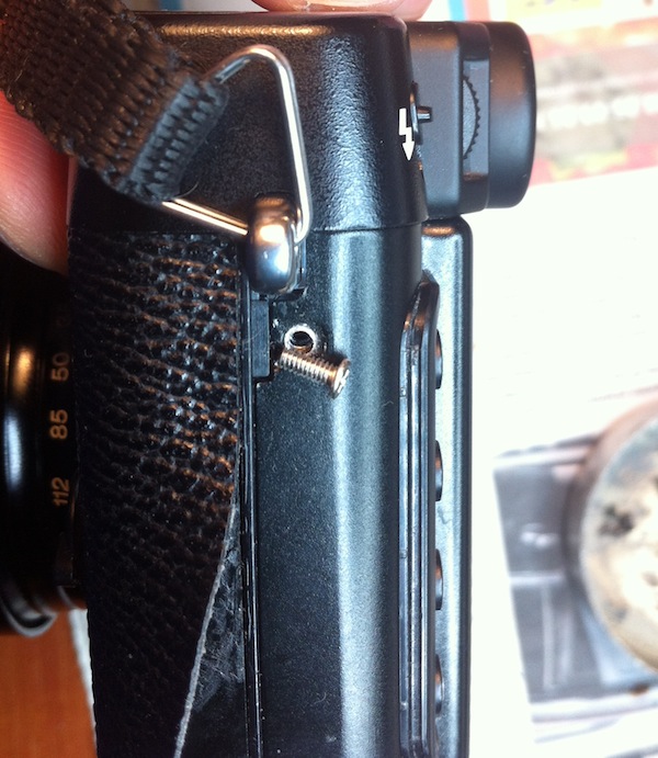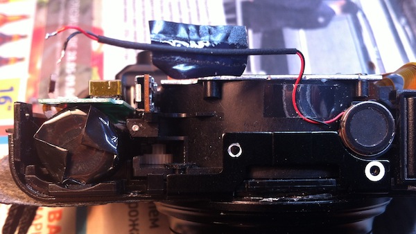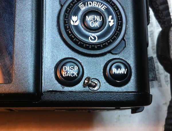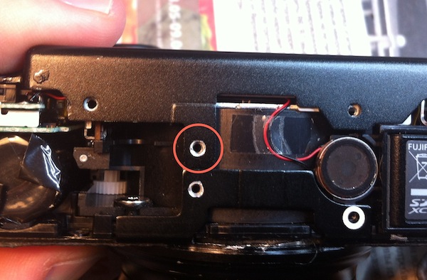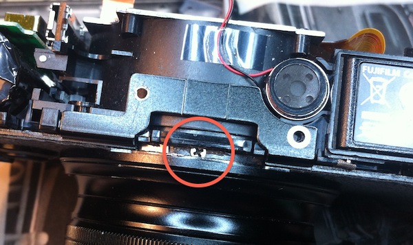 А вот и причина поломки — выпавший винтик заклинило между корпусом камеры и тубусом объектива: