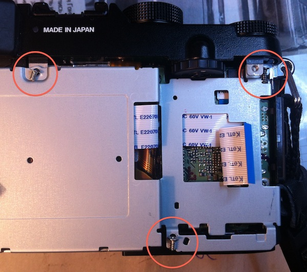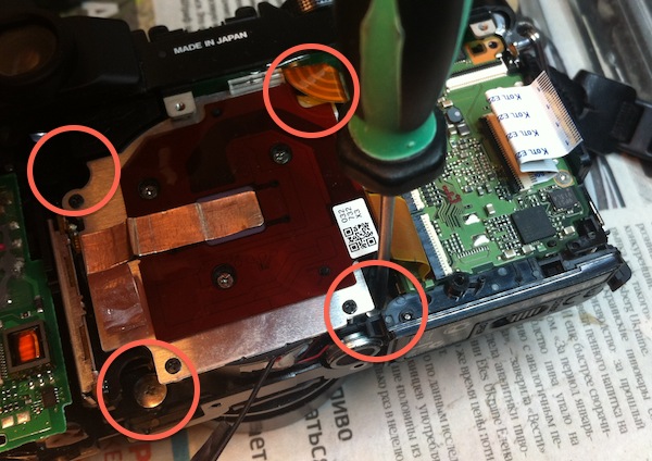 И наконец, когда снята железная пластина мы получаем доступ к четырем большим винтам, которые держат блок объектив+матрица: